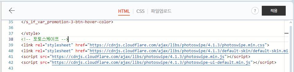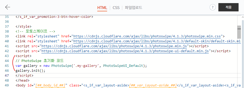 다음의 코드를 복사하여 티스토리 HTML 편집기에 붙여 넣습니다. 이 코드는 PhotoSwipe 라이브러리를 불러오는 역할을 합니다. 이 코드는 갤러리를 활성화하고, 사용자가 이미지를 클릭할 때 PhotoSwipe를 실행합니다.
