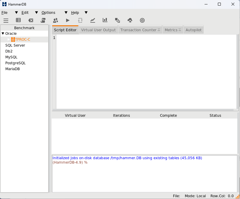 hammerdb 명령을 실행하면 아래와 같이 HammerDB GUI가 열리고 테스트를 구성하고 실행할 수 있습니다.