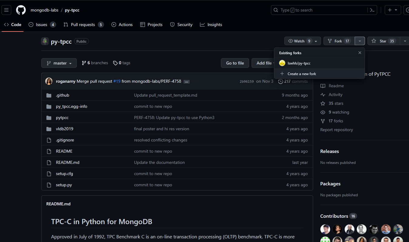 먼저 py-tpcc를 내 github repository로 fork합니다. 아래 이미지처럼 Fork를 눌러서 "Create a new fork"를 누르면 쉽게 fork 할 수 있습니다.