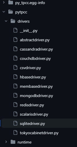 현재 pytpcc에 존재하는 drivers들은 다양하게 있는데, RDBMS 류는 sqlite만 존재합니다. sqlite 외에는 cassandra, couchdb, hbase, membase, mongodb, redis, 등이 있습니다.